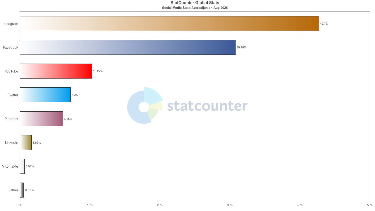 По новым данным Global Stats, Instagram остаётся самой популярной соцсетью в Азербайджане: в августе её доля рынка выросла до 42,7 %. Это на 8,69 п.п. больше, чем месяцем ранее, что укрепило доминирование платформы.