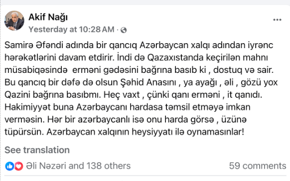 Не ограничившись эмоциональной критикой, Наğı перешёл к прямым призывам оскорблять певицу, заявляя, что каждый азербайджанец должен плевать ей в лицо, если встретит на улице.